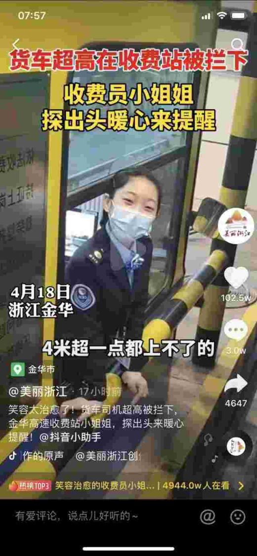 4月19日,义乌一条高速公路收费员劝返超高车辆的视频引发了网友的广泛好评,网友热赞收费员笑容甜美、服务态度好,多个抖音号点赞数达到30万+,最高评论数达到3万+。