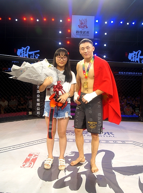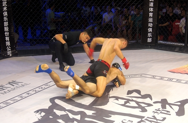 高潮是一波接一波,接下来出场的是蓝方选手贺少帅对阵红方选手阿合纳尔•卡德尔汗,蓝方选手不负啦啦队的期盼,在第二回合2分08秒用背后裸绞战胜红方选手。